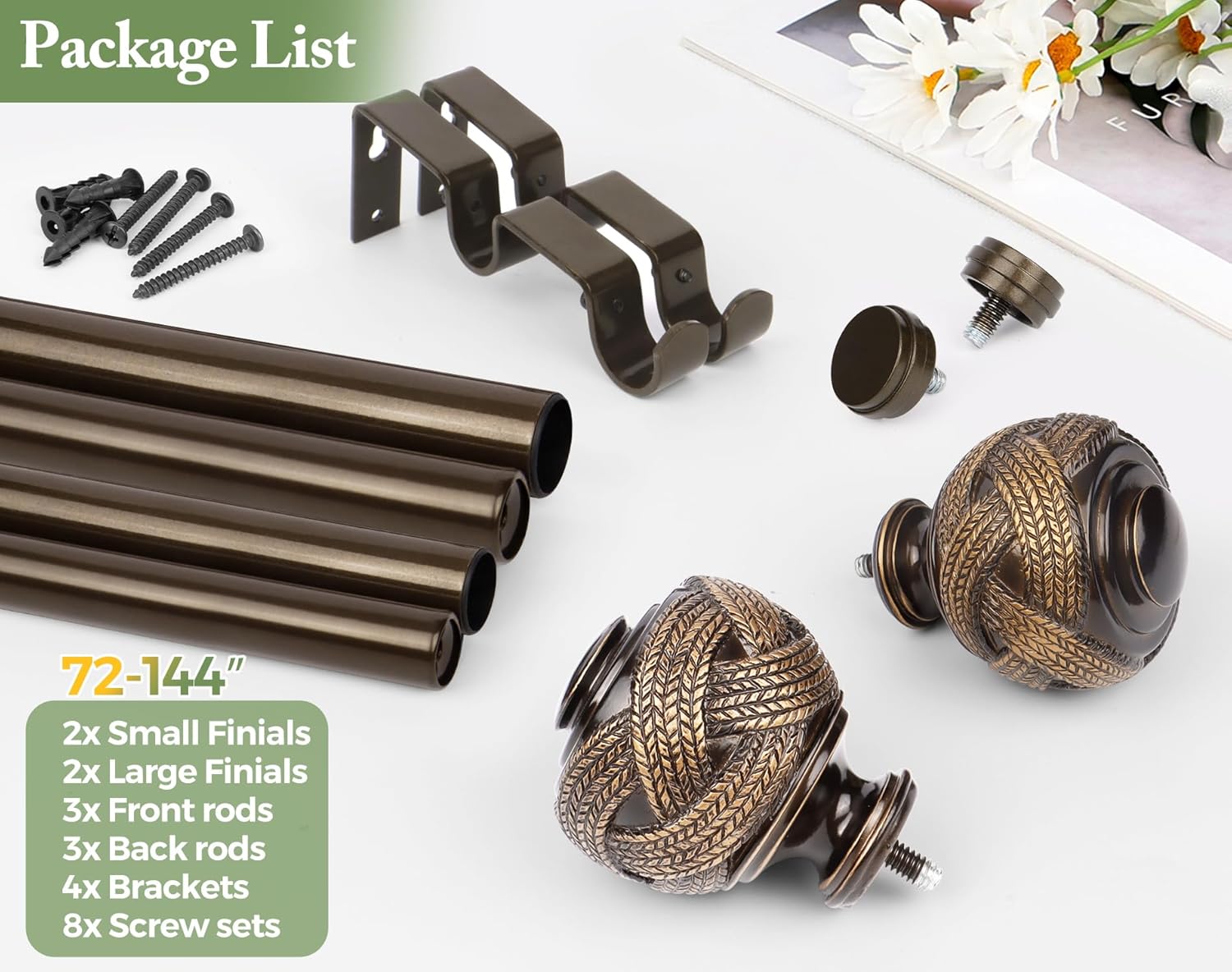 EASY TO INSTALL: USFOOK drapery rod set comes ready to hang with all the mounting hardware, including adjustable brackets, screws, drywall anchors and instructions. You can easily mount double rod in just a few steps and minutes