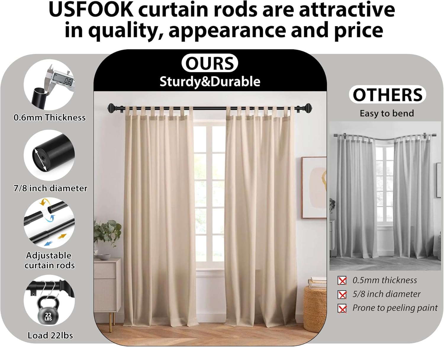 - ššššÆš²-šš®šš² šš®š«ššš¢š§ ššØšš¬: USFOOK drapery rods, made of premium steel with 7/8 Inch diameter and 0.6 mm thickness, support up to 22 lbs, giving you more freedom to choose your curtain style such as grommet curtains and clip drapes.